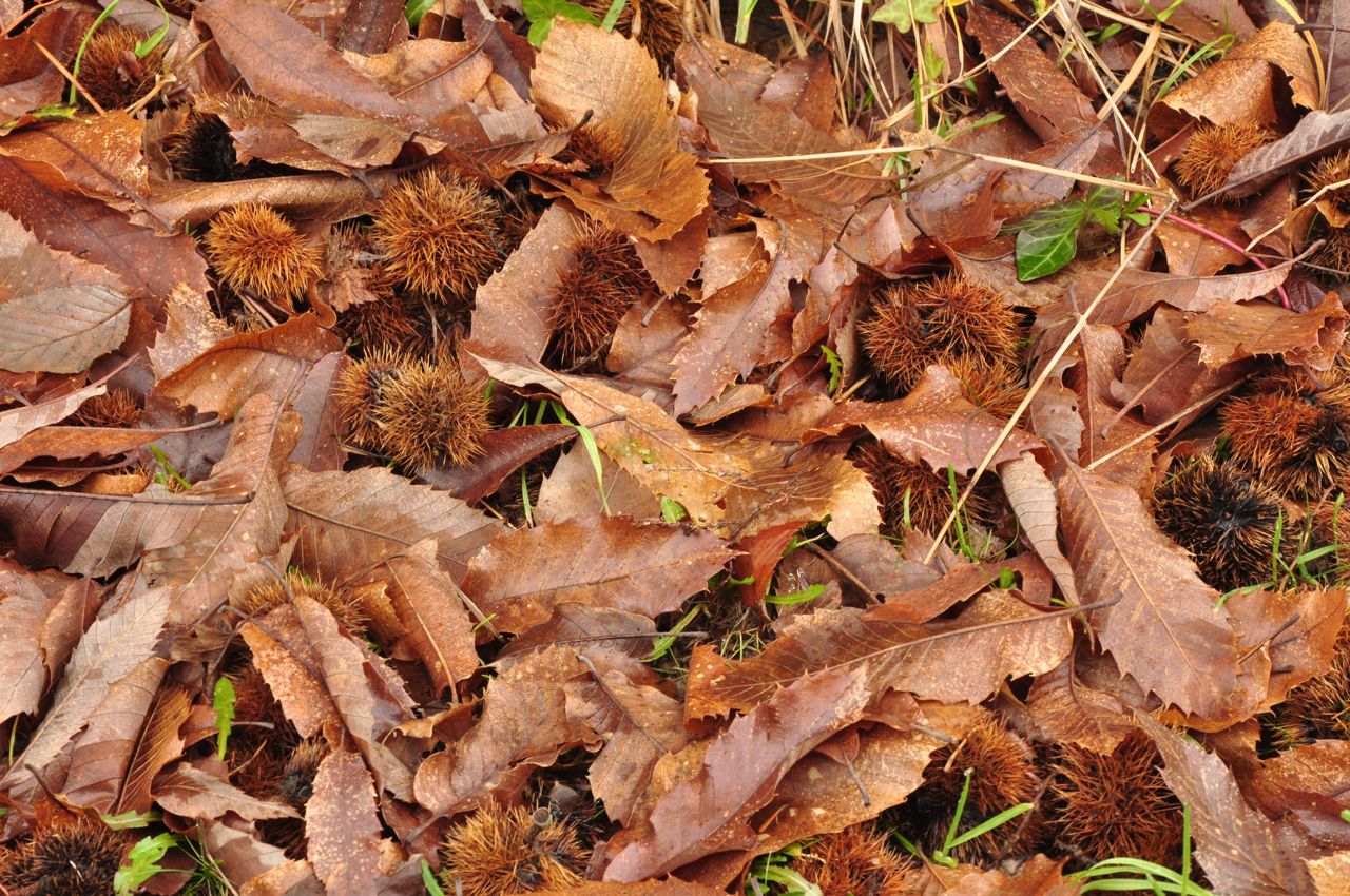 Chestnut burrs and leaves return to the earth