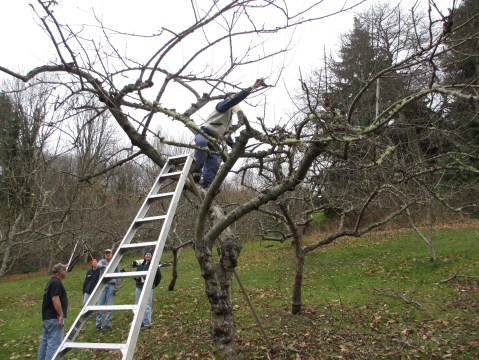 Bruce can hide his face, but not his beard, as he prunes his “adopted” tree.