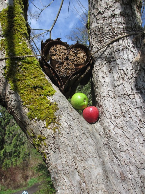 Art and fruit combine. This bee house was installed in the orchard last summer as part of the Heaven and Earth exhibition at Carkeek Park. We hope it will attract bees again this summer to help pollinate the fruit trees.